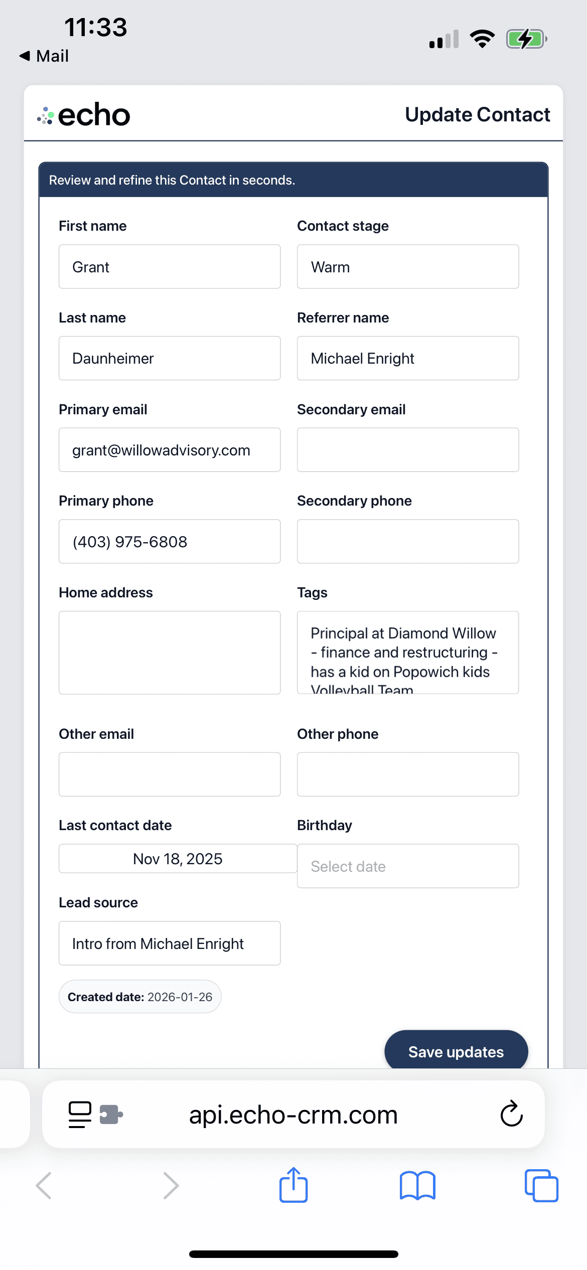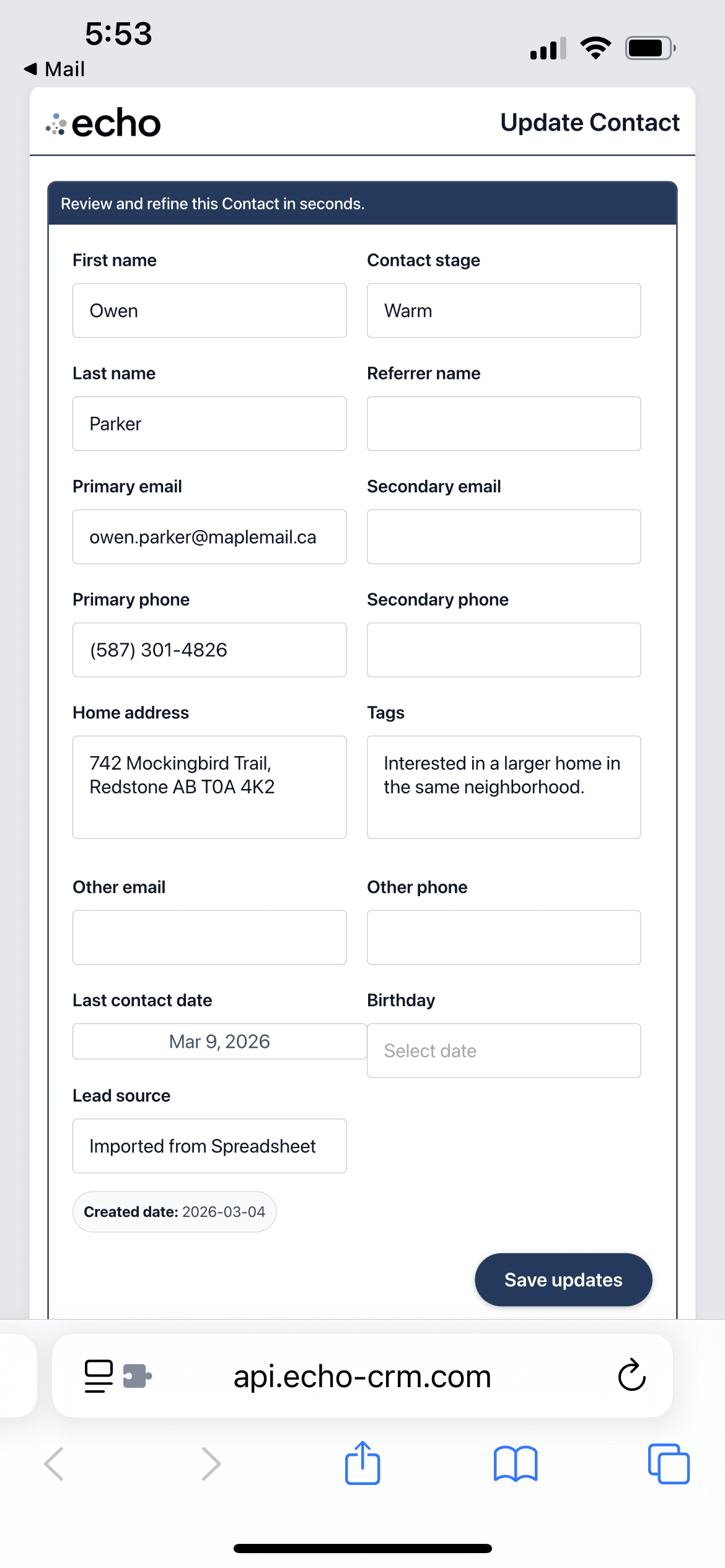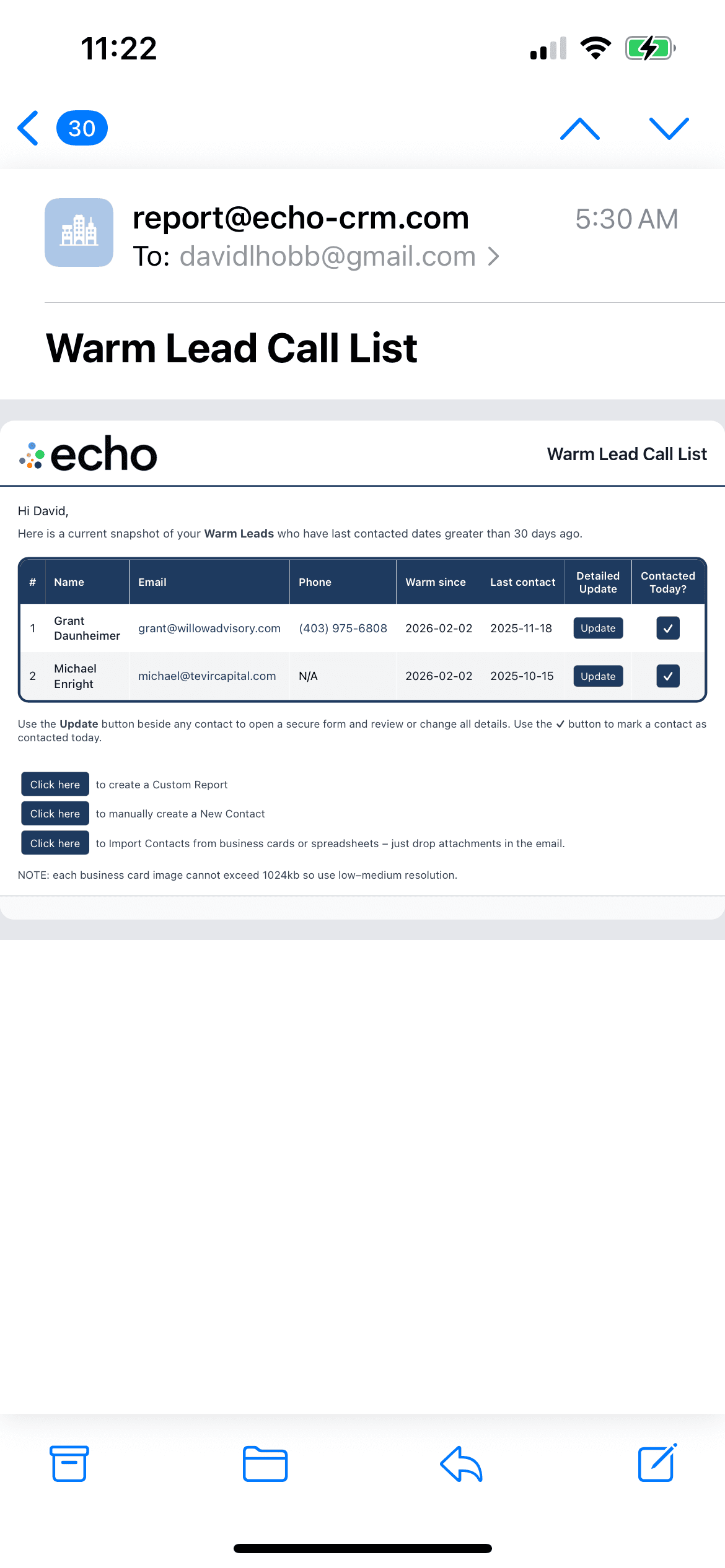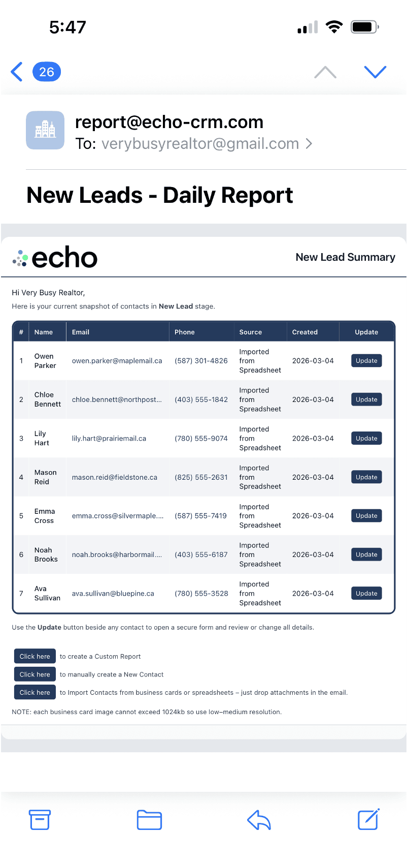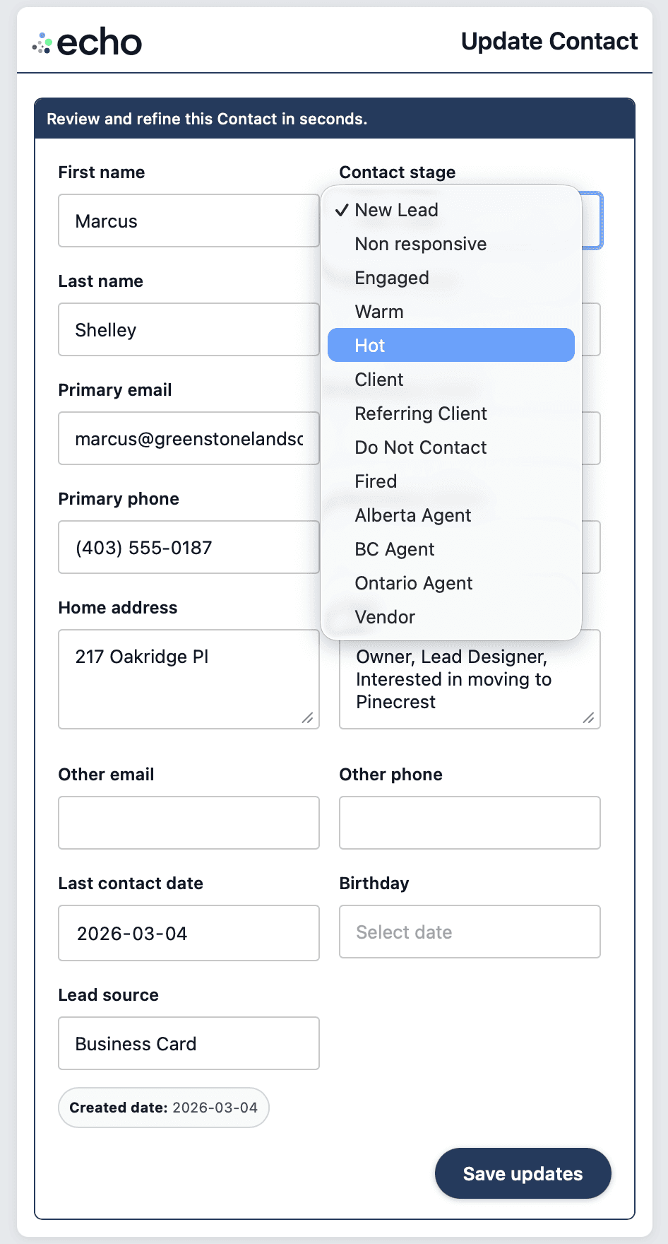 echo will suggest who you should contact, make any updates using the easy form, move on to your next lead.