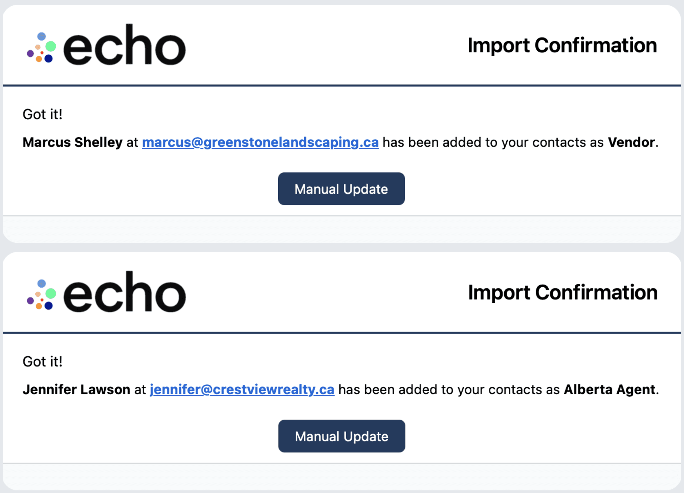 We process imports same day. Business cards get per-contact confirmations, spreadsheets get a single receipt, and updates take effect immediately.