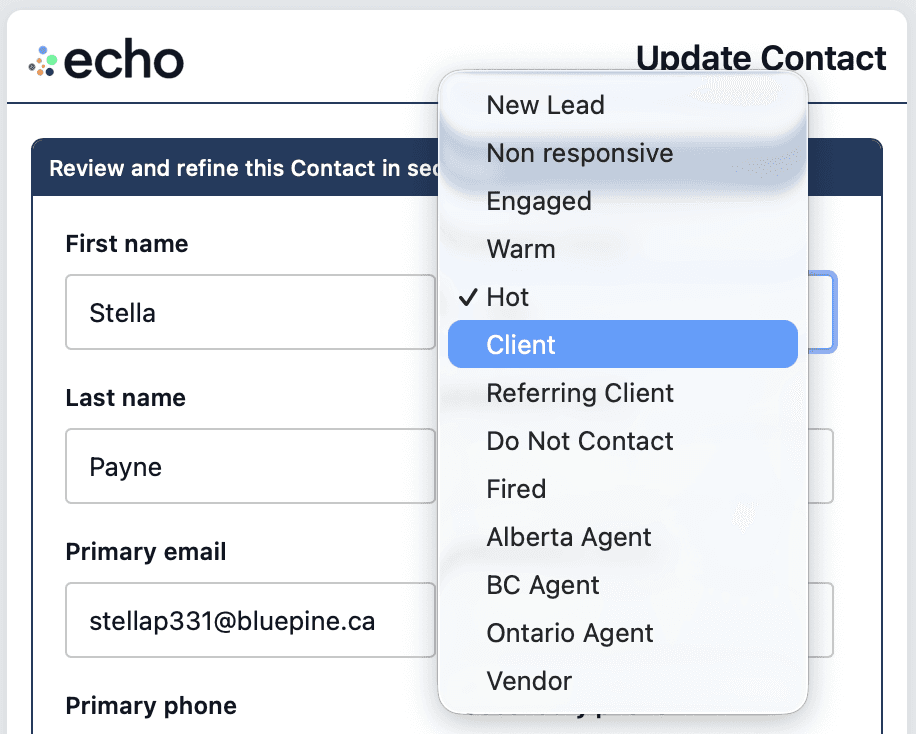 Example: if a contact is Engaged, and you speak with them and they mention they are starting to consider a potential move, change them to Warm. That tells echo to prompt you more often.