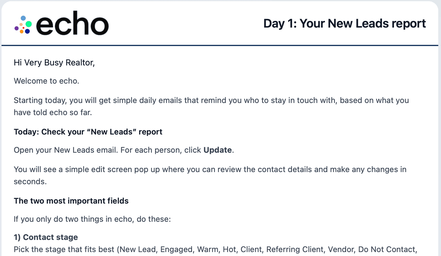 During your trial, echo guides you with short daily emails, each one focused on one simple habit, like reviewing New Leads, setting contact stages, handling duplicates, running Custom Reports, etc. The goal is not to learn software. The goal is to build consistent follow-up with the network you already have.